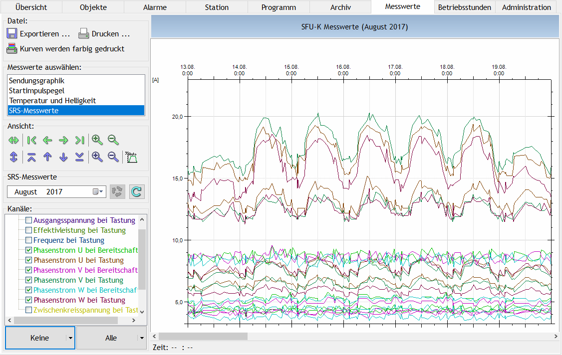 Die dargestellte Grafik zeigt das Beispiel einer Aufzeichnung der Senderströme bei einem Kunden, der die Senderschnittstelle im Einsatz hat. Deutlich sichtbar ist ein Bereich, wo der Senderstrom plötzlich stark angestiegen war. Aufgrund dieser Information war es dem Kunden möglich, ohne Zeitverzug sofort zielgerichtet auf die Suche nach der Ursache zu gehen.